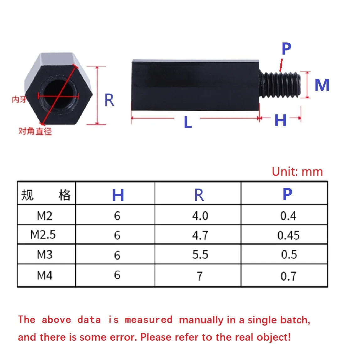 1000pcs Male To Female Thread M2/2.5/3/4*L + 6mm Black Plastic Nylon Hexagon Hex Standoff Spacer Pillars