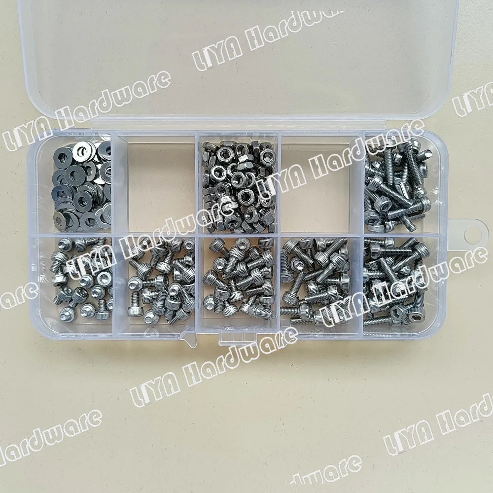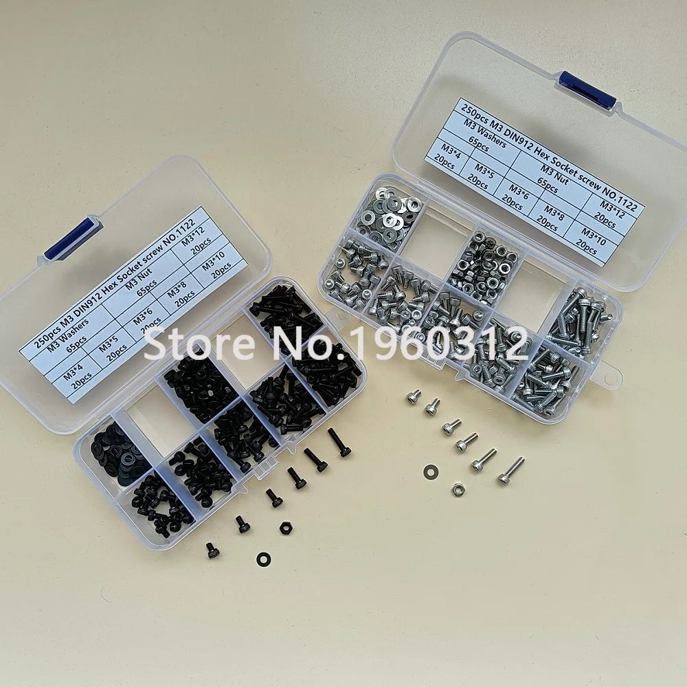 250 pcs/setM3 Mix Hex Socket Head Cap Screw & Nuts & Washers Kit List: