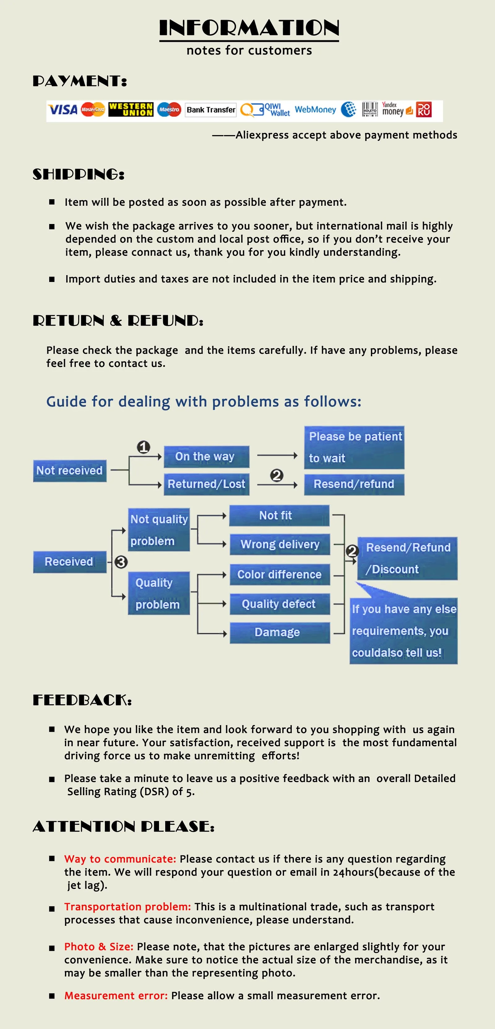 2. Your feedback is very important for us, before giving us neutral or negative feedback, we hope you to contact us,so that we can satisfactorily solve your problem!